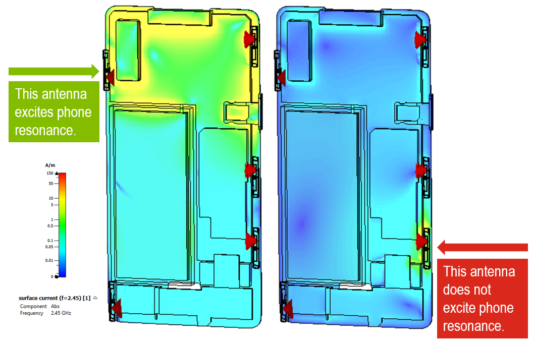 The antennas don’t only function as standalone “antennas” in the traditional sense, but there is a strong interaction with the rest of phone. Understanding the resonant behavior of the phone is important since the antenna to couple energy into natural phone resonances. These are strongly dependent on the exact configuration of the internal structure, which can change over design cycles.